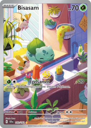 Bisasam liegt entspannt nahe einem Fenster in der Sonne, was die Stimmung der Karte besonders friedlich und einladend macht. Das Motiv der Schlafszene unterstreicht Bisasams liebenswürdigen und ruhigen Charakter. Die Karte gehört zu den Secret Rares der Serie, was bedeutet, dass sie sich durch ihre kunstvolle Illustration und den Sammlerwert abhebt. Die kunstvolle Darstellung ist minimalistisch, aber dennoch detailliert, was die Karte besonders ästhetisch ansprechend macht.