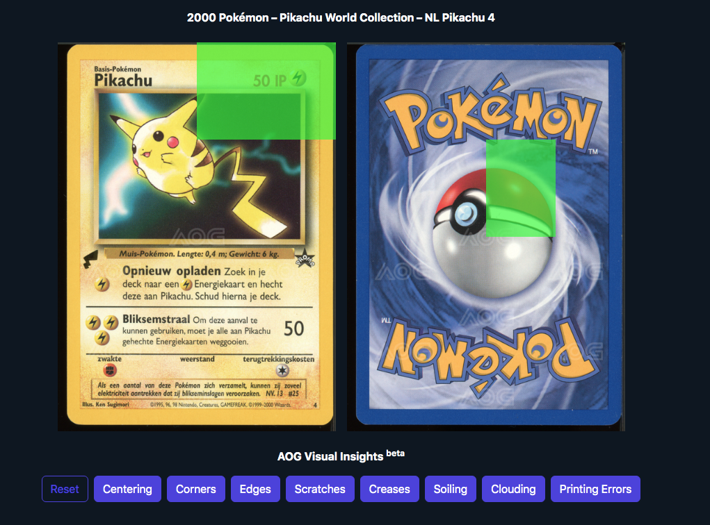 Wie oben zu sehen ist, können Sie auf alle Punkte klicken, nach denen bewertet wird, und dabei wird digital angezeigt, wo der Mangel liegt. Sehen Sie sich zum Beispiel unten die Zentrierung der Pikachu-Karte an.