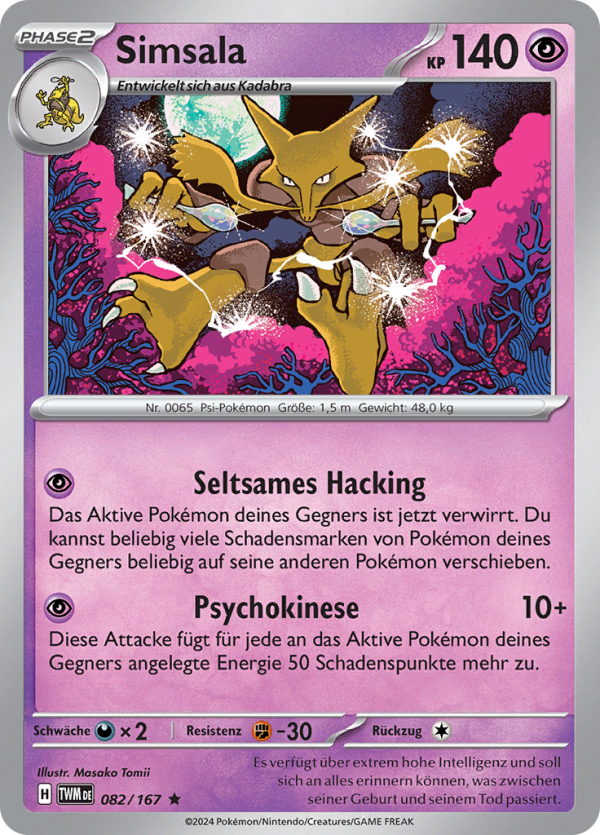| Kaufen? | Kaufen Sie Ihre Simsala Pokemon-Karte aus dem Maskerade im Zwielicht-Erweiterung. |
