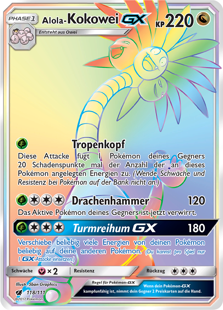 | Kaufen? | Kaufen Sie Ihre Alola-Kokowei-GX Pokemon-Karte aus dem Aufziehen der Sturmröte-Erweiterung. |