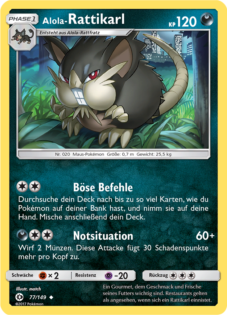 | Kaufen? | Kaufen Sie Ihre Alola-Rattikarl Pokemon-Karte aus dem Sonne & Mond-Erweiterung. |