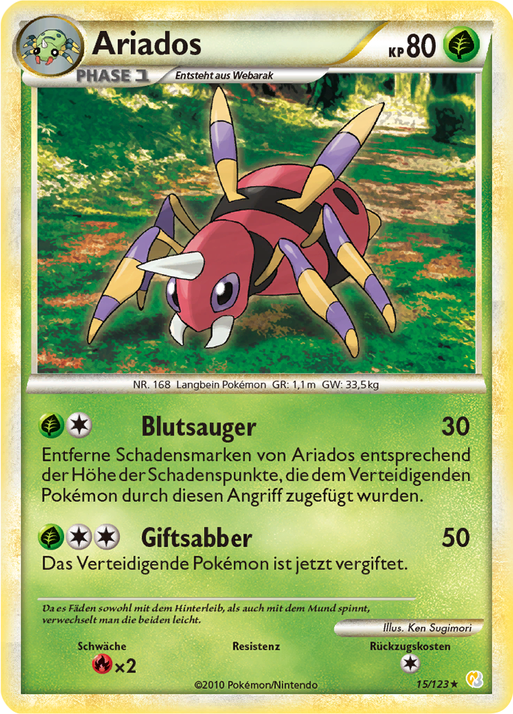 | Kaufen? | Kaufen Sie Ihre Ariados Pokemon-Karte aus dem Heartgold und Soulsilver-Erweiterung. |