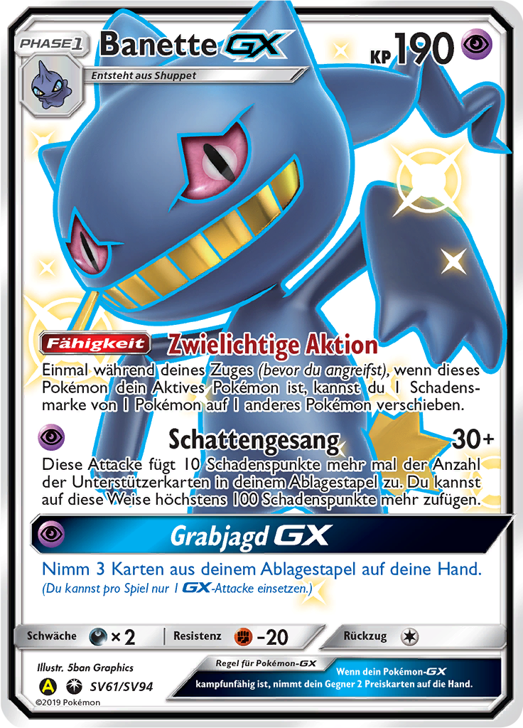 | Kaufen? | Kaufen Sie Ihre Banette-GX Pokemon-Karte aus dem Verborgenes Schicksal - Schillernde Schatzkammer-Erweiterung. |