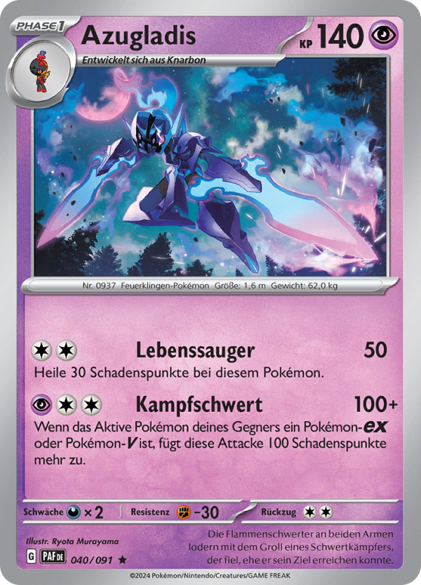 | Kaufen? | Kaufen Sie Ihre Azugladis Pokemon-Karte aus dem Paldeas Schicksale-Erweiterung. |