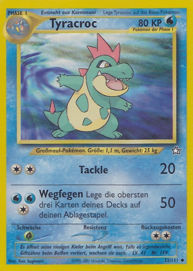| Kaufen? | Kaufen Sie Ihre Tyracroc Pokemon-Karte aus dem Neo Genesis-Erweiterung. |