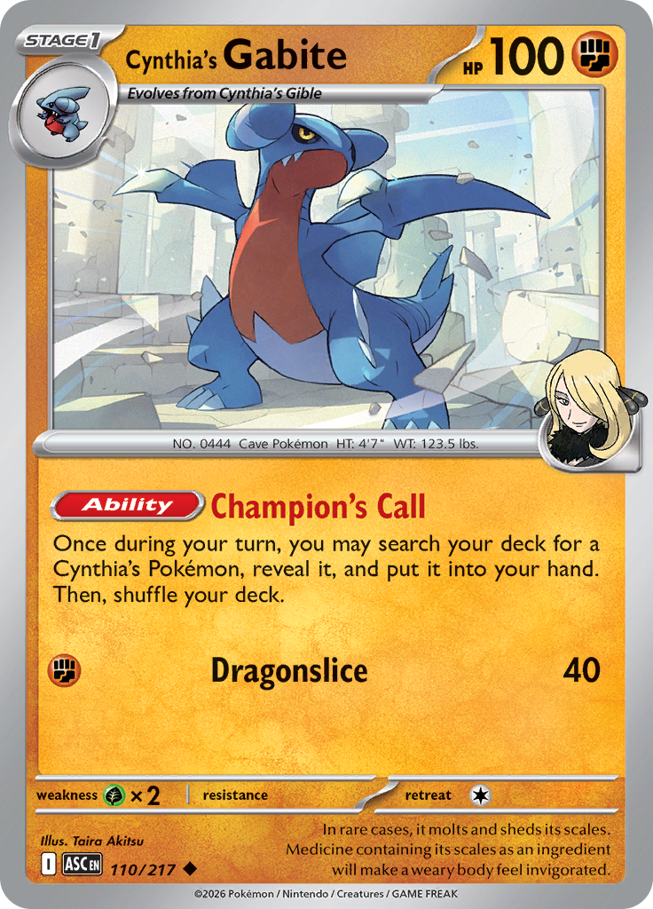| Kaufen? | Kaufen Sie Ihre Cynthia's Gabite Pokemon-Karte aus dem Ascended Heroes-Erweiterung. |