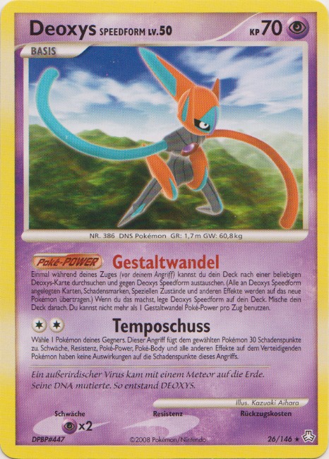 | Kaufen? | Kaufen Sie Ihre Deoxys Speedform Pokemon-Karte aus dem Erwachte Legenden-Erweiterung. |
