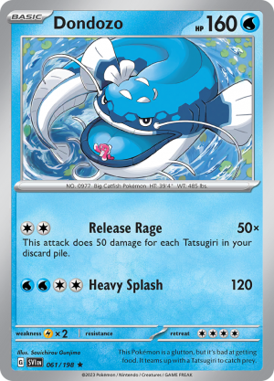 | Kaufen? | Kaufen Sie Ihre Dondozo Pokemon-Karte aus dem Paldean Fates-Erweiterung. |