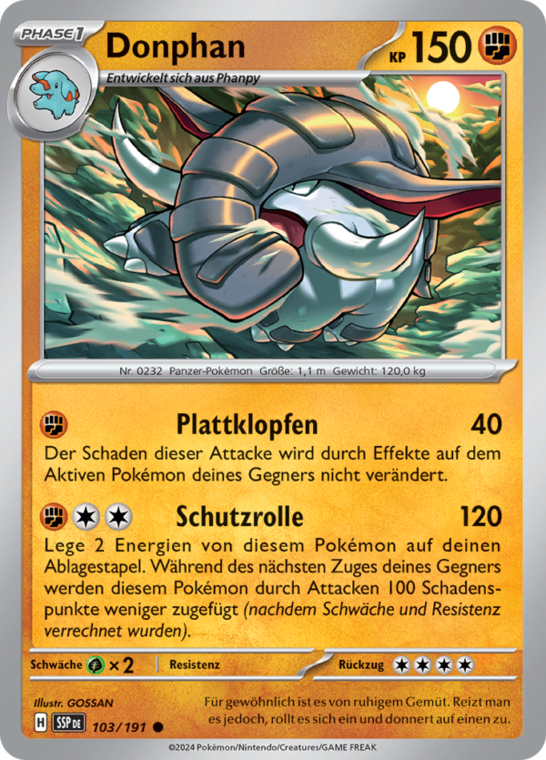 | Kaufen? | Kaufen Sie Ihre Donphan Pokemon-Karte aus dem Sturmische Funken-Erweiterung. |
