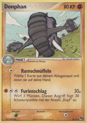 | Alle Karten | Sehen Sie alle Donphan-Pokémonkarten in einer Übersicht. |