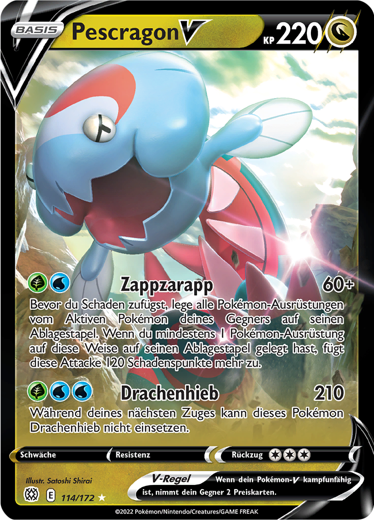 | Kaufen? | Kaufen Sie Ihre Pescragon V Pokemon-Karte aus dem Strahlende Sterne-Erweiterung. |