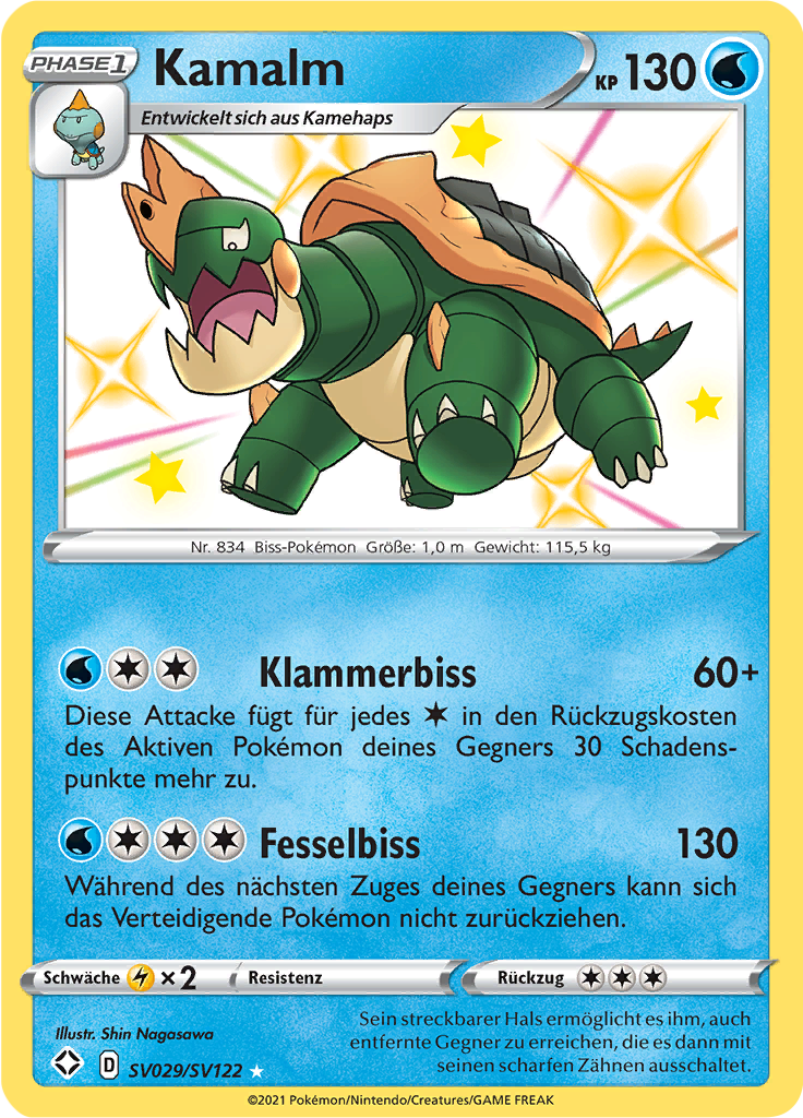 | Kaufen? | Kaufen Sie Ihre Kamalm Pokemon-Karte aus dem Glänzendes Schicksal - Schillernde Schatzkammer-Erweiterung. |