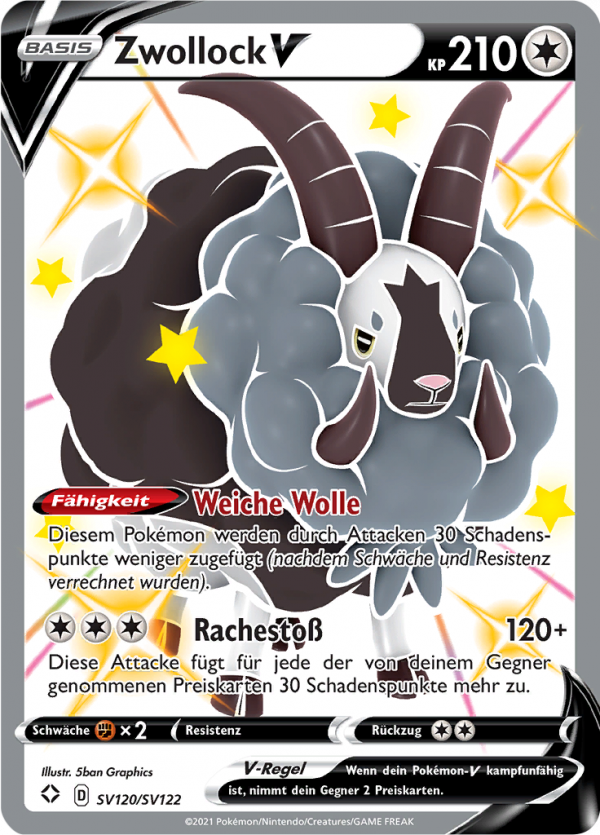 | Kaufen? | Kaufen Sie Ihre Zwollock V Pokemon-Karte aus dem Glänzendes Schicksal - Schillernde Schatzkammer-Erweiterung. |