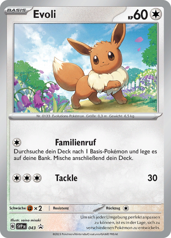 | Kaufen? | Kaufen Sie Ihre Evoli Pokemon-Karte aus dem Karmesin & Purpur Promos-Erweiterung. |
