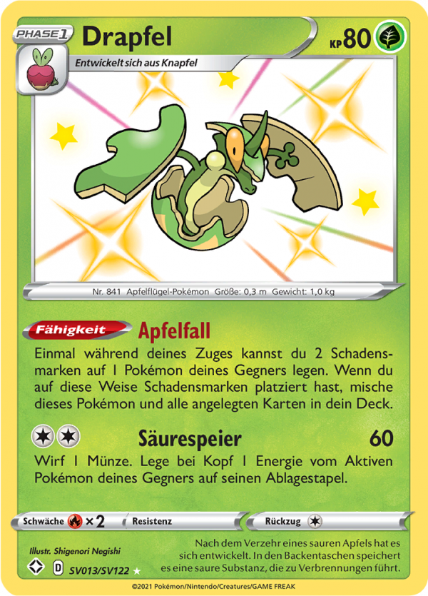 | Kaufen? | Kaufen Sie Ihre Drapfel Pokemon-Karte aus dem Glänzendes Schicksal - Schillernde Schatzkammer-Erweiterung. |