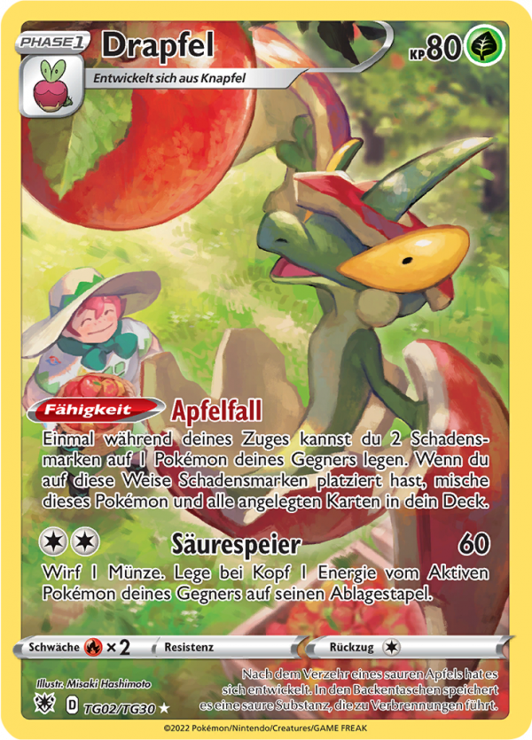 | Kaufen? | Kaufen Sie Ihre Drapfel Pokemon-Karte aus dem Astralglanz - Trainergalerie-Erweiterung. |