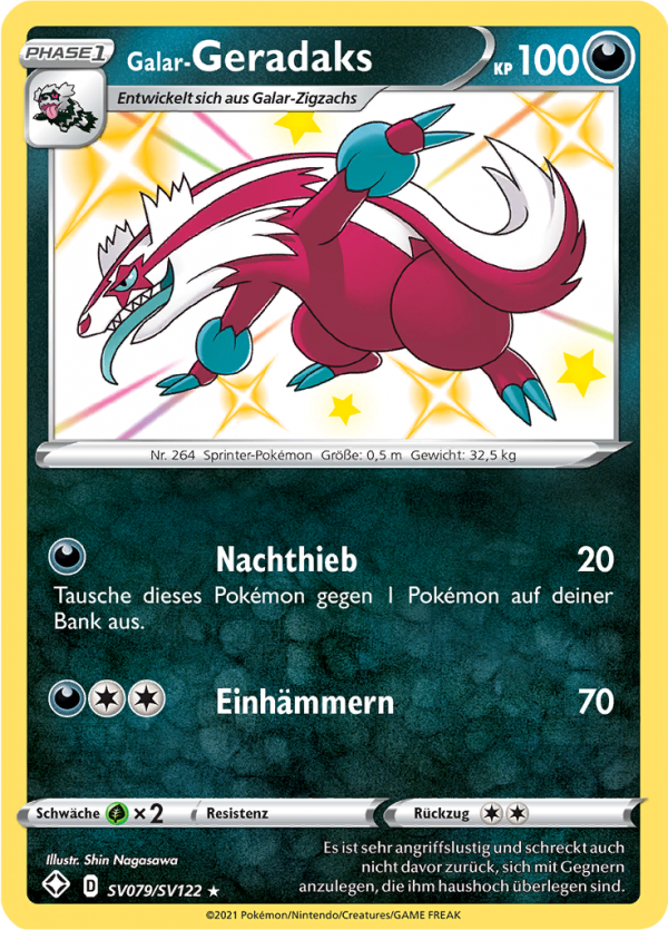 | Kaufen? | Kaufen Sie Ihre Galar-Geradaks Pokemon-Karte aus dem Glänzendes Schicksal - Schillernde Schatzkammer-Erweiterung. |
