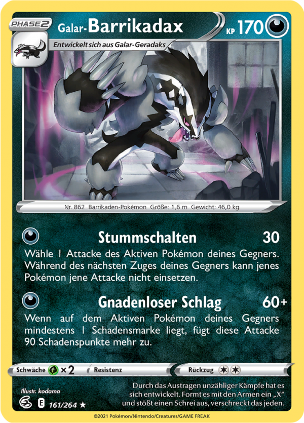 | Kaufen? | Kaufen Sie Ihre Galar-Barrikadax Pokemon-Karte aus dem Fusionsangriff-Erweiterung. |