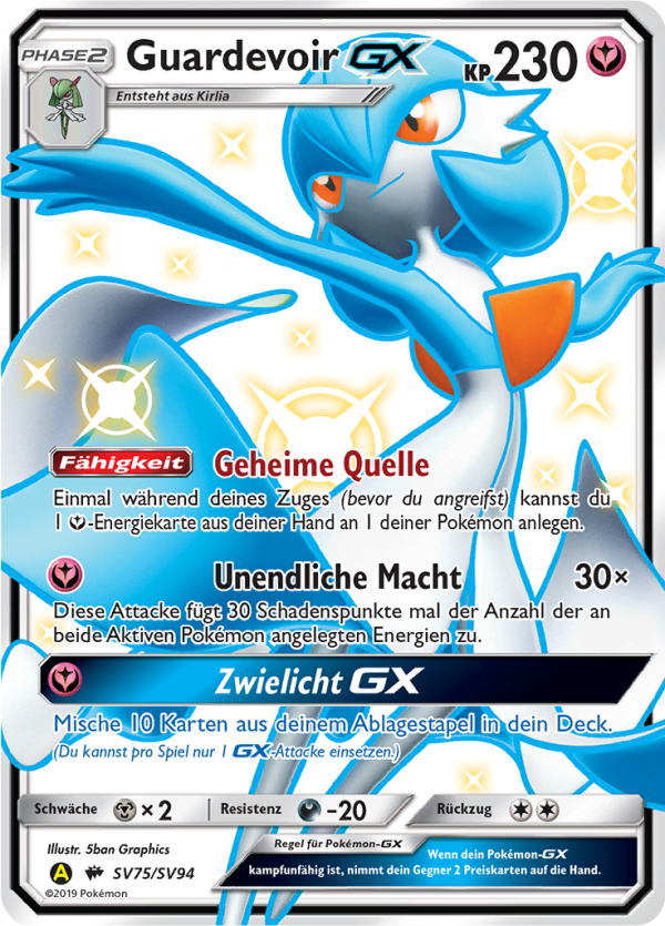 | Kaufen? | Kaufen Sie Ihre Guardevoir-GX Pokemon-Karte aus dem Verborgenes Schicksal - Schillernde Schatzkammer-Erweiterung. |