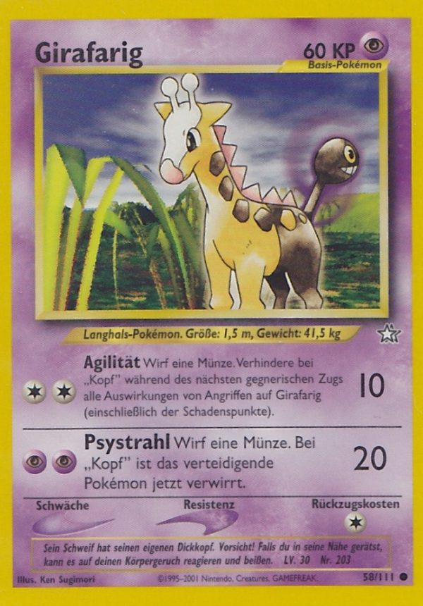 | Kaufen? | Kaufen Sie Ihre Girafarig Pokemon-Karte aus dem Neo Genesis-Erweiterung. |