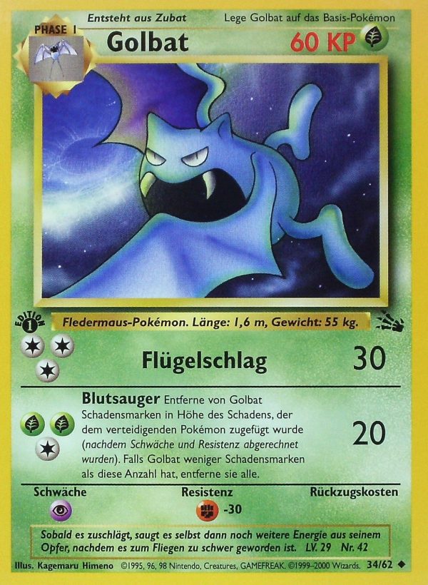 | Kaufen? | Kaufen Sie Ihre Golbat Pokemon-Karte aus dem Fossil-Erweiterung. |