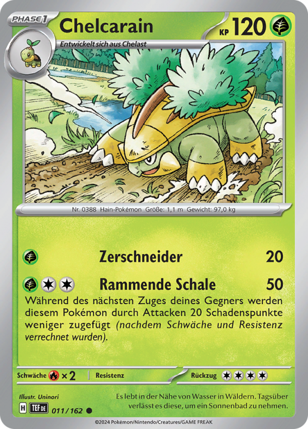 | Kaufen? | Kaufen Sie Ihre Chelcarain Pokemon-Karte aus dem Gewalten der Zeit-Erweiterung. |