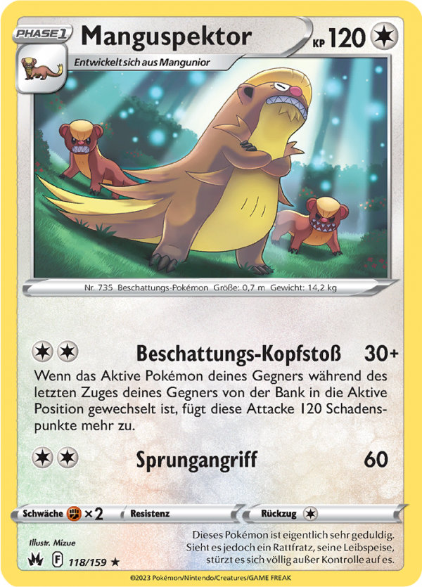 | Kaufen? | Kaufen Sie Ihre Manguspektor Pokemon-Karte aus dem Zenit der Könige-Erweiterung. |