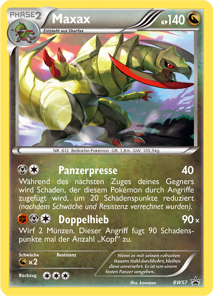 | Kaufen? | Kaufen Sie Ihre Maxax Pokemon-Karte aus dem Schwarz & Weiss Promos-Erweiterung. |