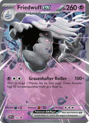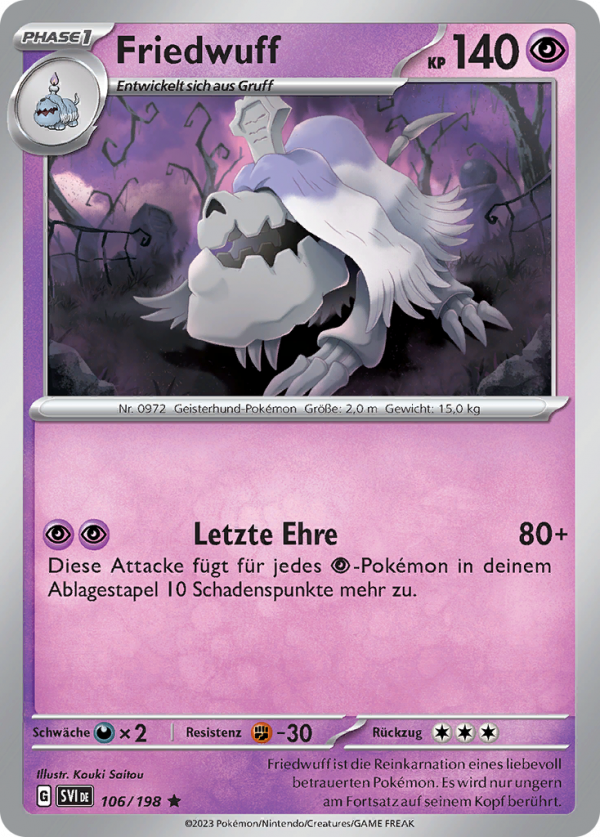 | Kaufen? | Kaufen Sie Ihre Friedwuff Pokemon-Karte aus dem Karmesin & Purpur-Erweiterung. |
