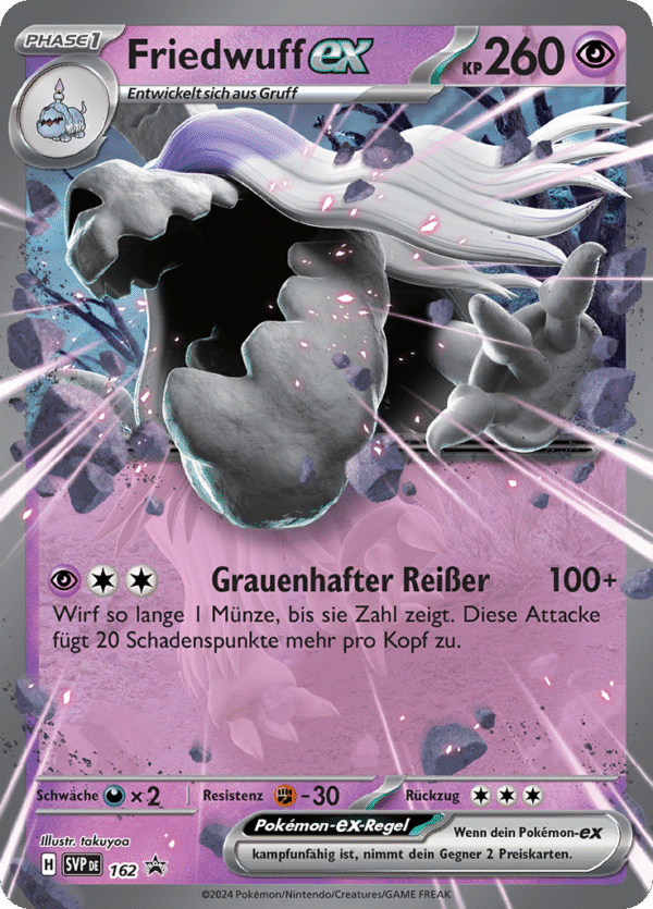 | Kaufen? | Kaufen Sie Ihre Friedwuff-ex Pokemon-Karte aus dem Karmesin & Purpur Promos-Erweiterung. |