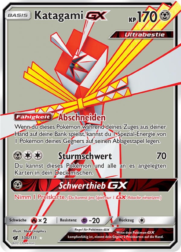 | Kaufen? | Kaufen Sie Ihre Katagami-GX Pokemon-Karte aus dem Aufziehen der Sturmröte-Erweiterung. |