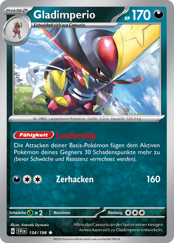| Kaufen? | Kaufen Sie Ihre Gladimperio Pokemon-Karte aus dem Karmesin & Purpur-Erweiterung. |