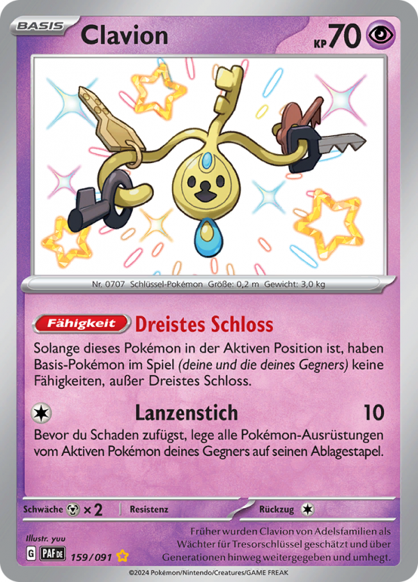 | Kaufen? | Kaufen Sie Ihre Clavion Pokemon-Karte aus dem Paldeas Schicksale-Erweiterung. |