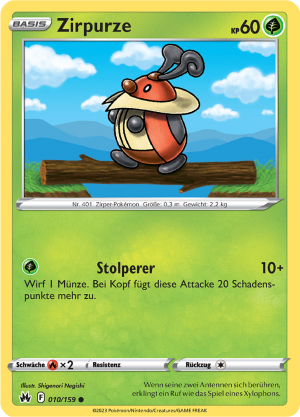 | Kaufen? | Kaufen Sie Ihre Zirpurze Pokemon-Karte aus dem Kommende Schicksale-Erweiterung. |
