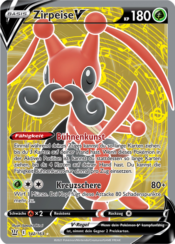 | Alle Karten | Sehen Sie alle Zirpeise-Pokémonkarten in einer Übersicht. |