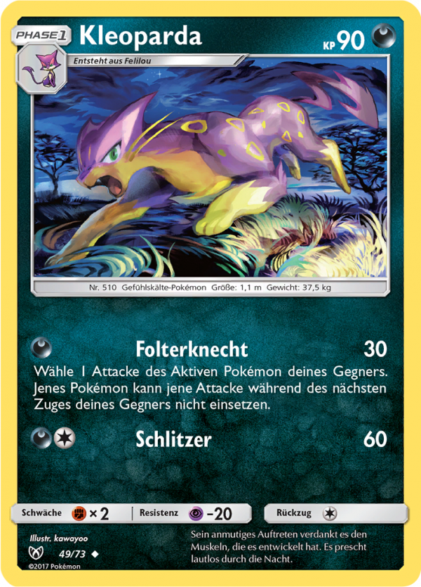 | Kaufen? | Kaufen Sie Ihre Kleoparda Pokemon-Karte aus dem Schimmernde Legenden-Erweiterung. |