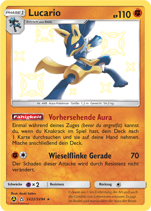 | Kaufen? | Kaufen Sie Ihre Lucario Pokemon-Karte aus dem Verborgenes Schicksal - Schillernde Schatzkammer-Erweiterung. |