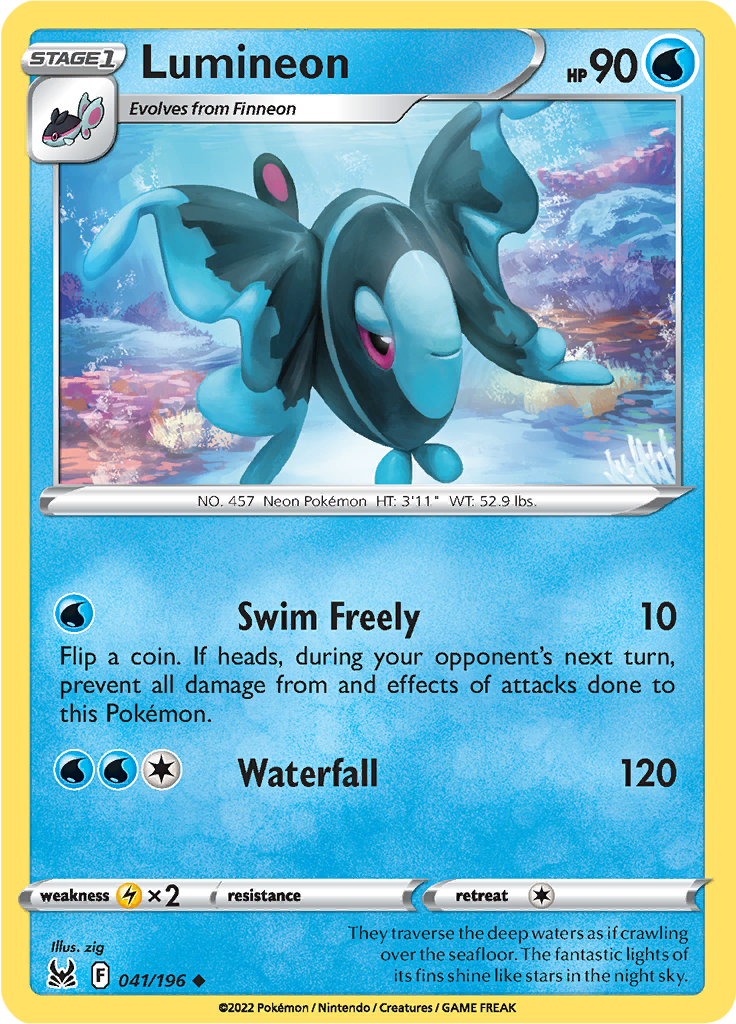| Kaufen? | Kaufen Sie Ihre Lumineon Pokemon-Karte aus dem Lost Origin-Erweiterung. |