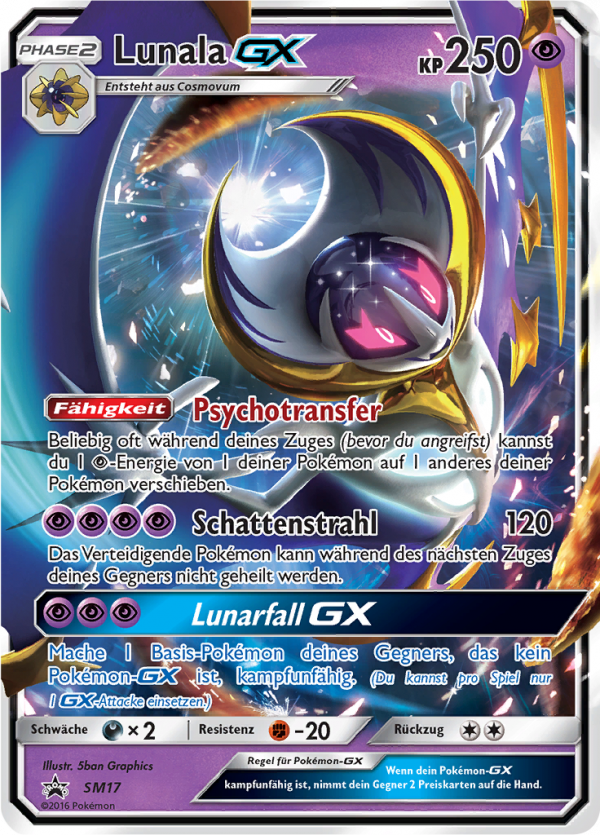 | Kaufen? | Kaufen Sie Ihre Lunala-GX Pokemon-Karte aus dem Sun & Moon Promos-Erweiterung. |