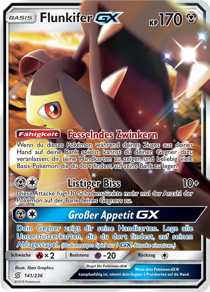 | Kaufen? | Kaufen Sie Ihre Flunkifer-GX Pokemon-Karte aus dem Bund der Gleichgesinnten-Erweiterung. |