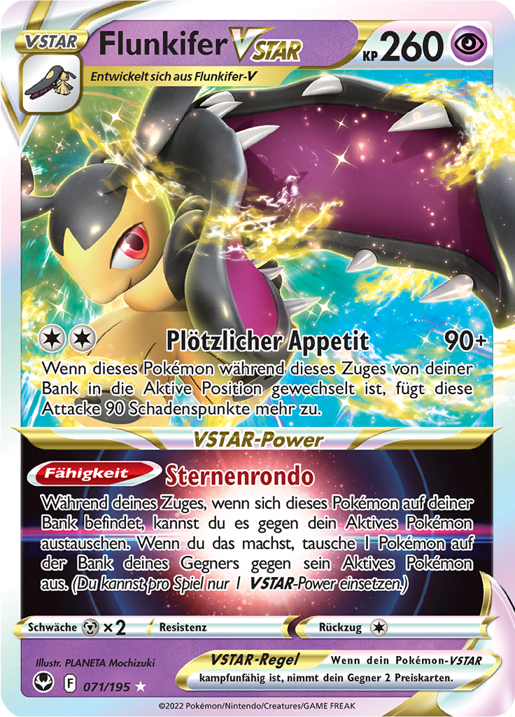 | Kaufen? | Kaufen Sie Ihre Flunkifer VSTAR Pokemon-Karte aus dem Silberne Sturmwinde-Erweiterung. |