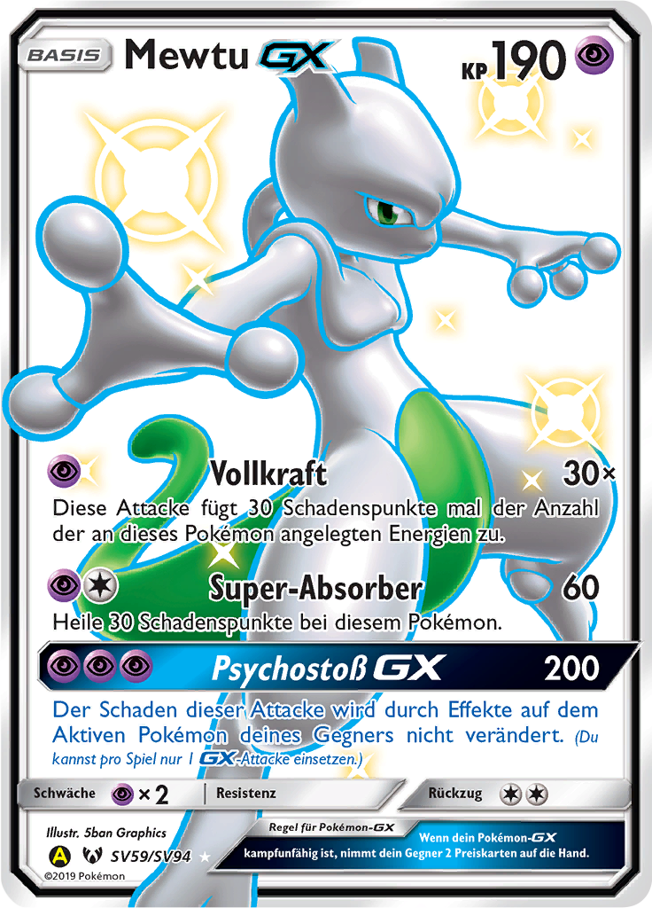 | Kaufen? | Kaufen Sie Ihre Mewtu-GX Pokemon-Karte aus dem Verborgenes Schicksal - Schillernde Schatzkammer-Erweiterung. |