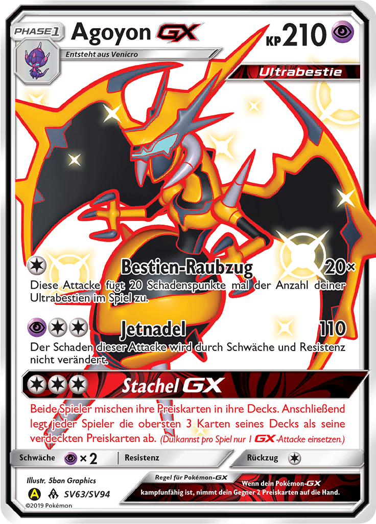 | Kaufen? | Kaufen Sie Ihre Agoyon-GX Pokemon-Karte aus dem Verborgenes Schicksal - Schillernde Schatzkammer-Erweiterung. |