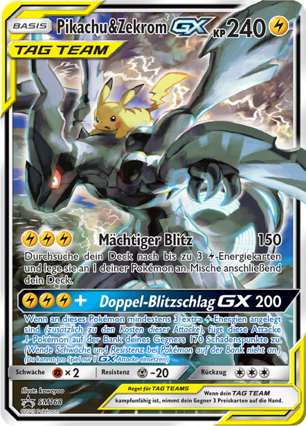| Kaufen? | Kaufen Sie Ihre Pikachu & Zekrom-GX Pokemon-Karte aus dem Sun & Moon Promos-Erweiterung. |