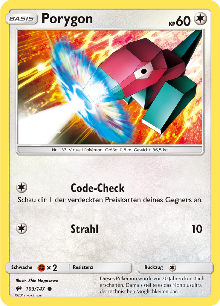 | Kaufen? | Kaufen Sie Ihre Porygon Pokemon-Karte aus dem Nacht in Flammen-Erweiterung. |