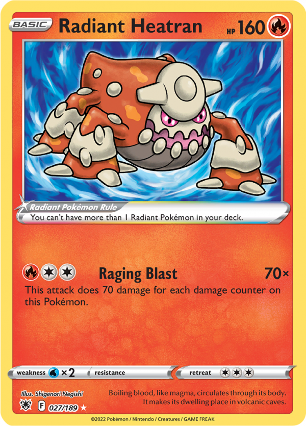 | Kaufen? | Kaufen Sie Ihre Radiant Heatran Pokemon-Karte aus dem Astral Radiance-Erweiterung. |