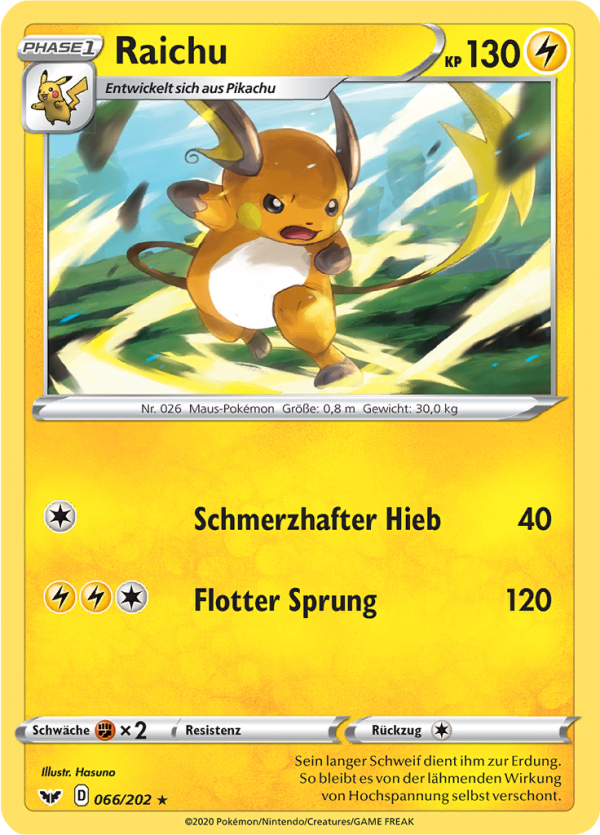 | Kaufen? | Kaufen Sie Ihre Raichu Pokemon-Karte aus dem Schwert & Schild-Erweiterung. |