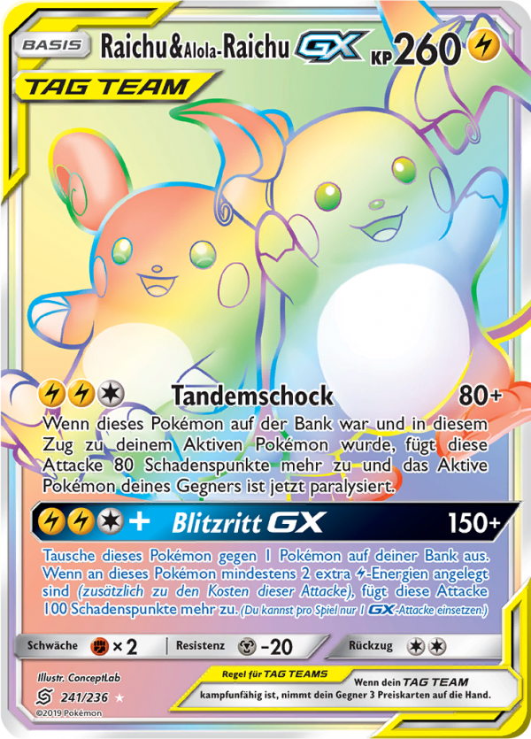 Kaufen? Kaufen Sie Ihre Raichu & Alola-Raichu-GX Pokemon-Karte aus dem Bund der Gleichgesinnten-Erweiterung.