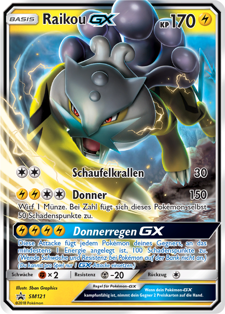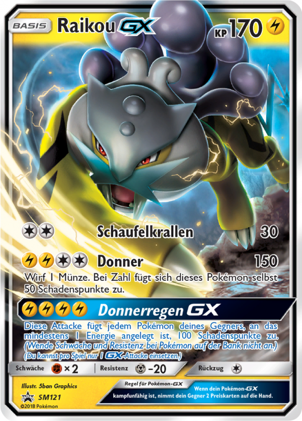 | Kaufen? | Kaufen Sie Ihre Raikou-GX Pokemon-Karte aus dem Sun & Moon Promos-Erweiterung. |