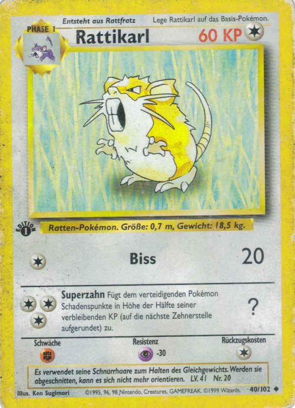| Kaufen? | Kaufen Sie Ihre Rattikarl Pokemon-Karte aus dem Grundset-Erweiterung. |